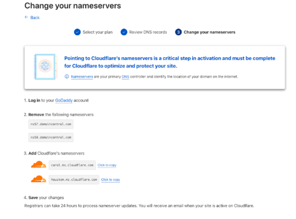 Folge den Anweisungen von Cloudflare, um die Nameserver deiner Domain auf Cloudflare umzustellen.