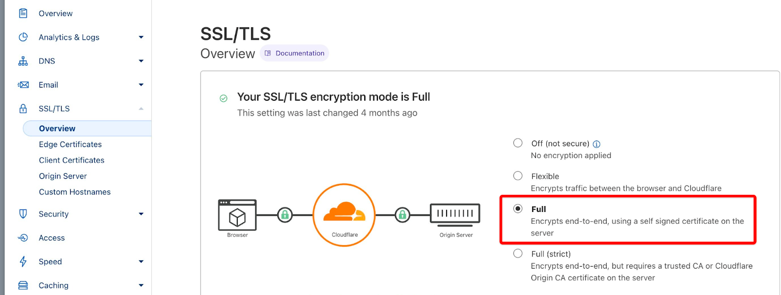Sobald die White-Label-Buchungsmaschine aktiviert ist, wird „Powered by RoomRaccoon“ von der Seite entfernt.Geh in deinem Cloudflare-Konto zum Bereich SSL/TLS und stell sicher, dass dein Verschlüsselungsmodus auf Voll eingestellt ist.
