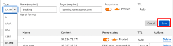 Füll den Eintrag aus, wähl als Typ „CNAME“, gib dann den gewünschten Namen für deine Subdomain ein, z. B. booking.[DeinDomainName.com]. Als Ziel gib booking.roomraccoon.com ein und klick auf Speichern.