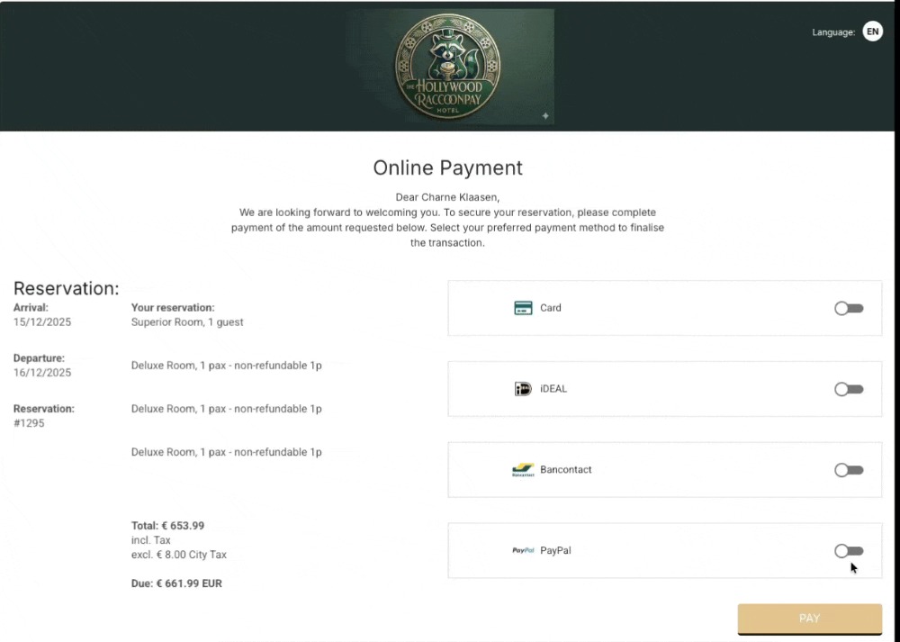 RoomRaccoon ermöglicht es dir, PayPal als Online-Zahlungsmethode anzubieten. So können Gäste mit ihrem PayPal-Guthaben, einem verknüpften Bankkonto oder den in PayPal gespeicherten Kreditkarten bezahlen.