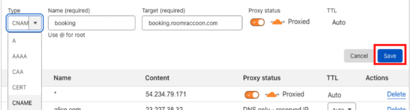 4. Fill in the record details by selecting the Type to be CNAME, then add the name for your subdomain, e.g., booking.[YourDomainName.com] Finally, enter the Target as booking.roomraccoon.com and click save.