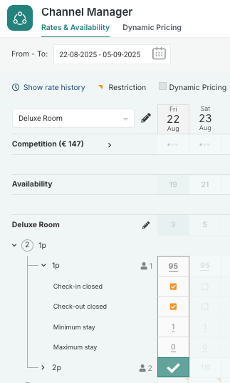 Closing check-in or check-out is a rate restriction where you decide which days guests cannot arrive or depart for a specific rate. Unlike closing a room, guests can still book stays over the restricted period, but they won’t be able to start or end their booking on the blocked dates.