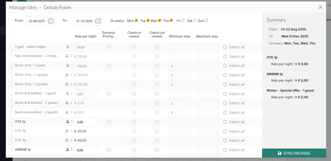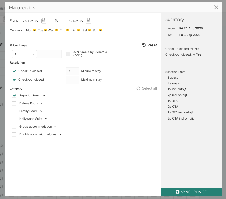 A stop-sell is a restriction that blocks availability for specific room types, rates, or channels on selected dates. This means guests cannot book those rooms or rates during the blocked period. It is especially useful for seasonal or promotional offers that should only be available at certain times. In RoomRaccoon, a rate type can only be closed by setting its price to 0€, which signals to all connected channels that the rate is no longer available.