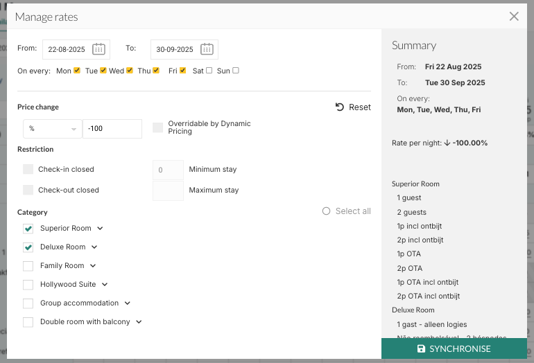 Select the date range, weekdays, and rates to apply restrictions.