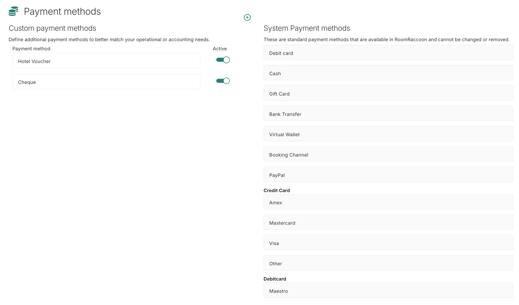 On the right-hand side, you will see the system payment methods. These are standard RoomRaccoon payment methods and cannot be edited or archived.