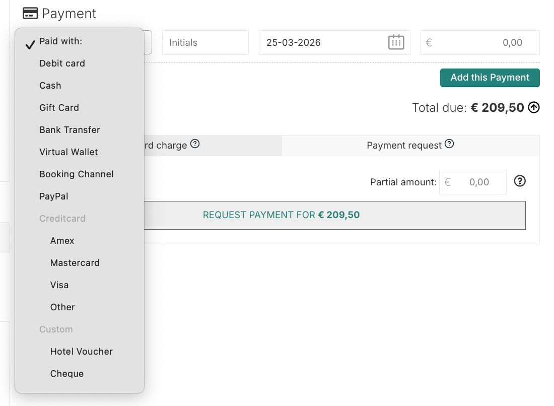 Custom payment methods will appear as an option in the “Paid with” dropdown when recording payments on reservations.