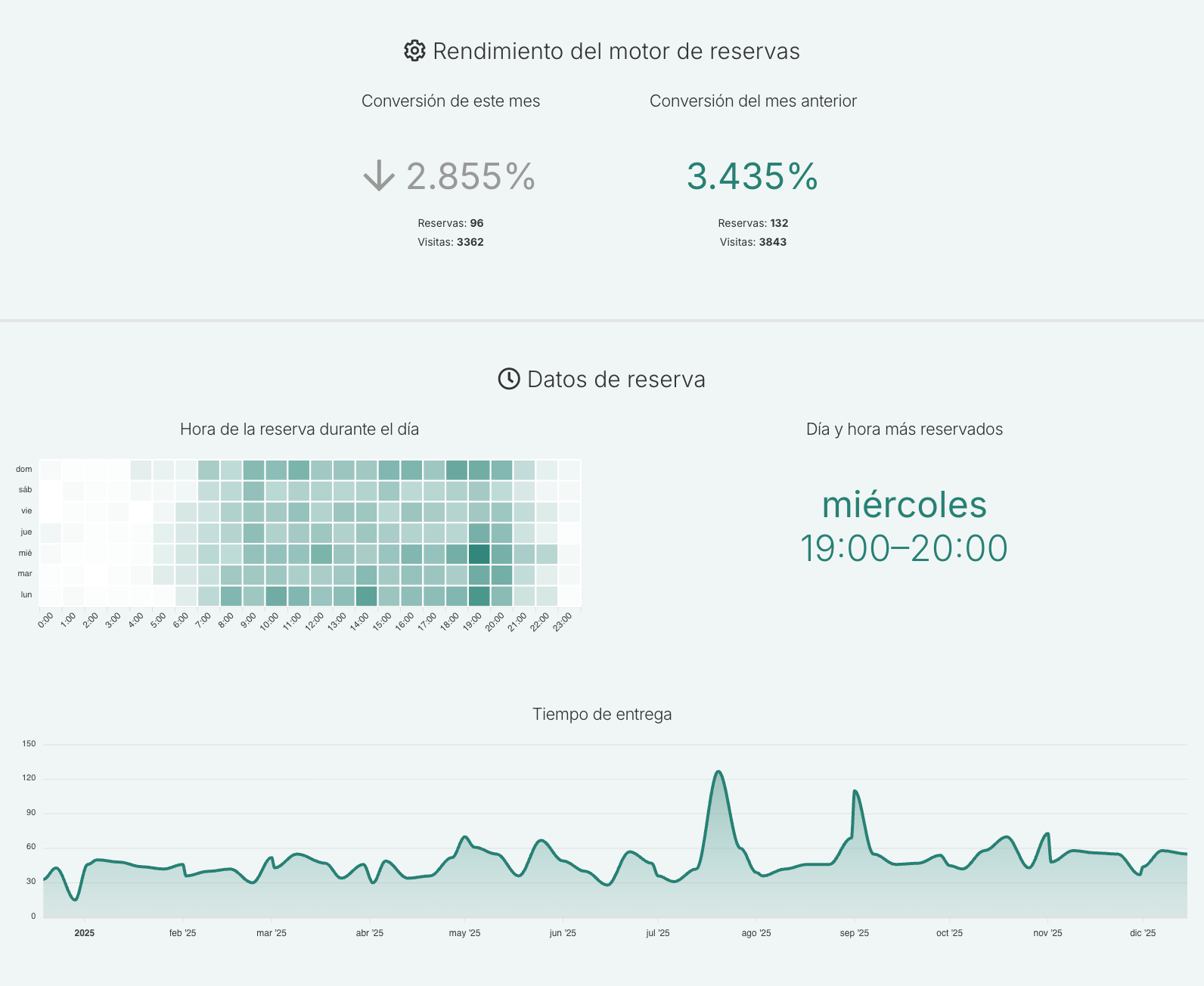 El panel también muestra información sobre el rendimiento de tu motor de reservas: