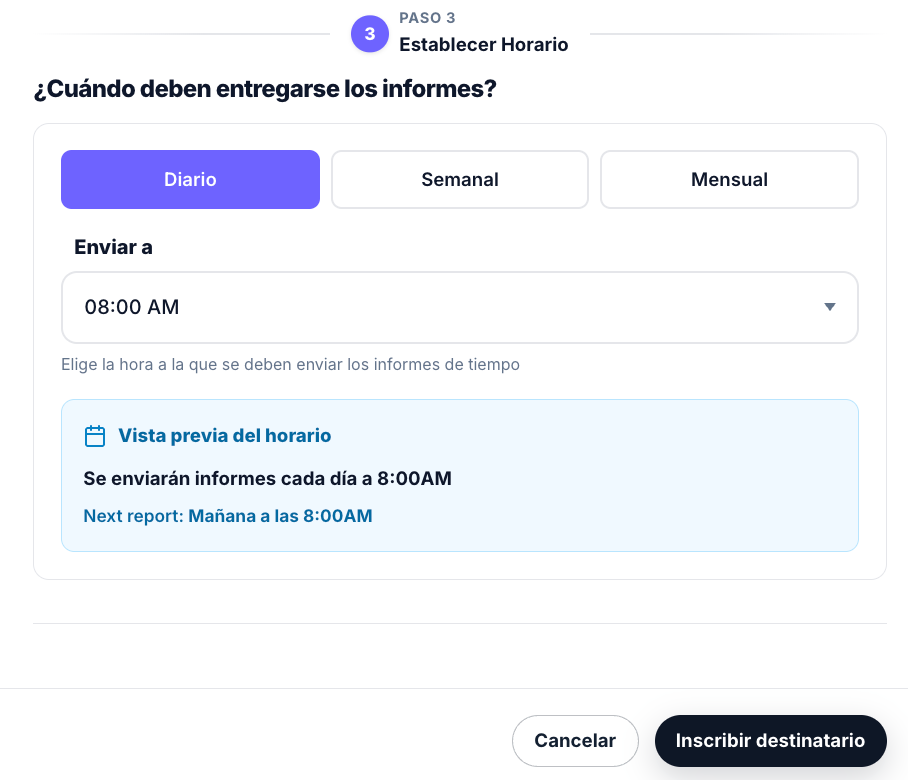 Seleccionar la programación: elige la frecuencia (diaria, semanal o mensual) y la hora de envío preferida.