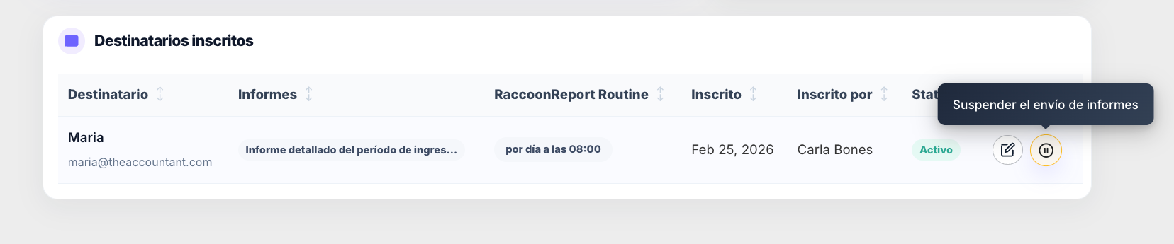 Puedes editar los destinatarios existentes y actualizar sus preferencias en cualquier momento. También puedes suspender temporalmente los informes si un usuario está de vacaciones o ya no necesita recibirlos.