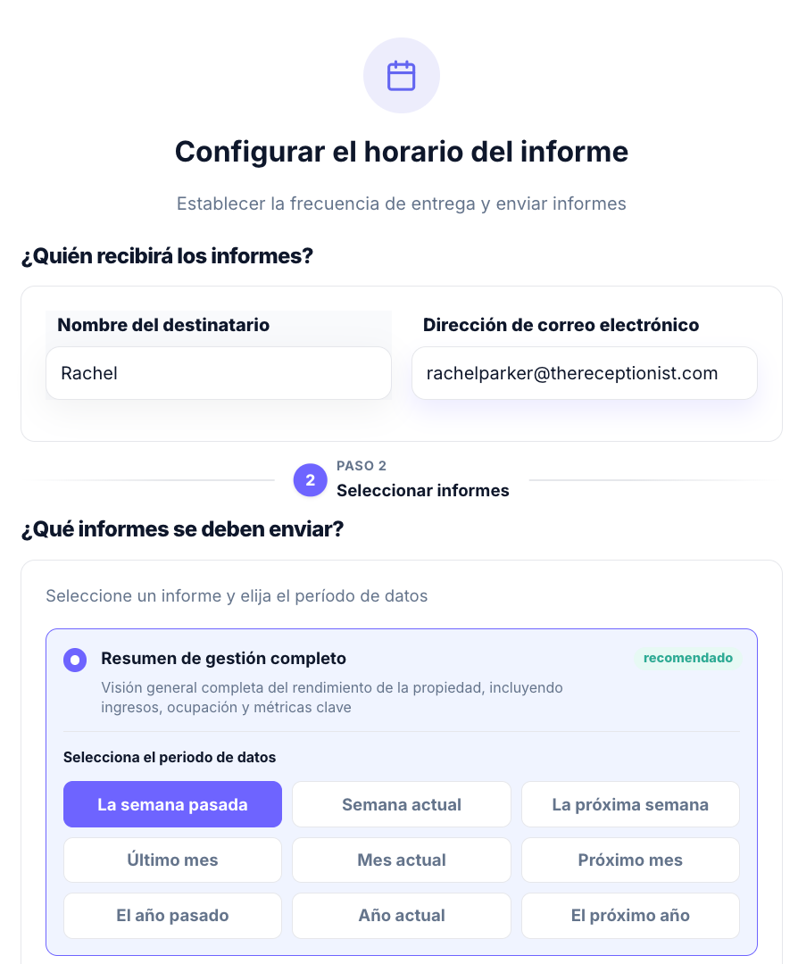 Seleccionar el informe: elige qué informe recibirá el destinatario y selecciona el periodo de datos correspondiente (esto varía según el informe).
