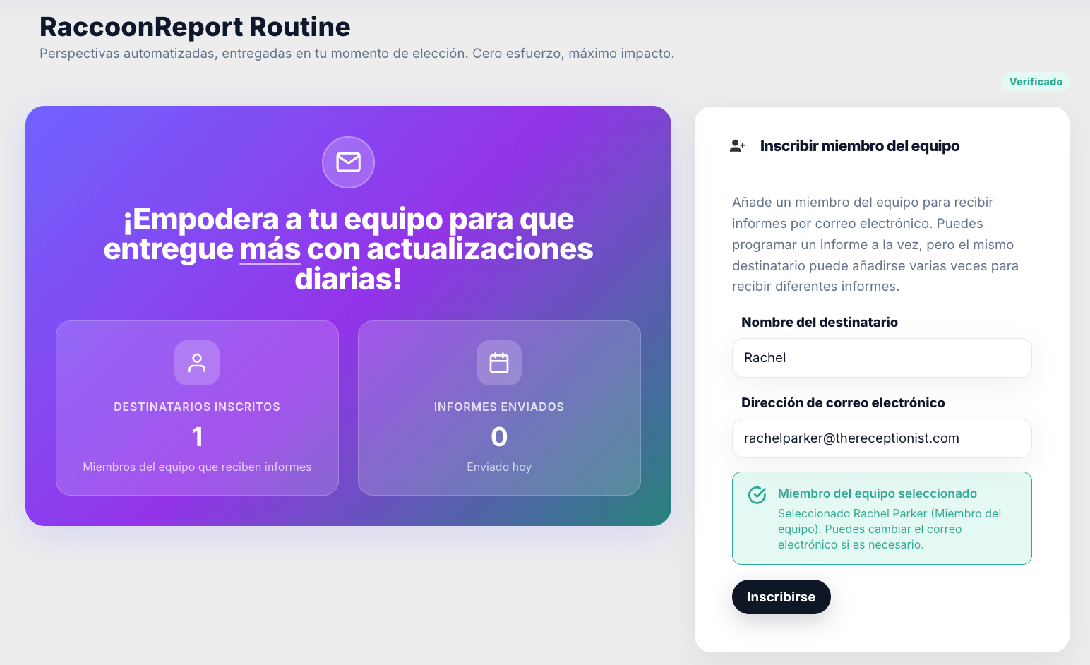 Una vez verificado, se te redirigirá al panel de RaccoonReport Rutina, donde podrás: