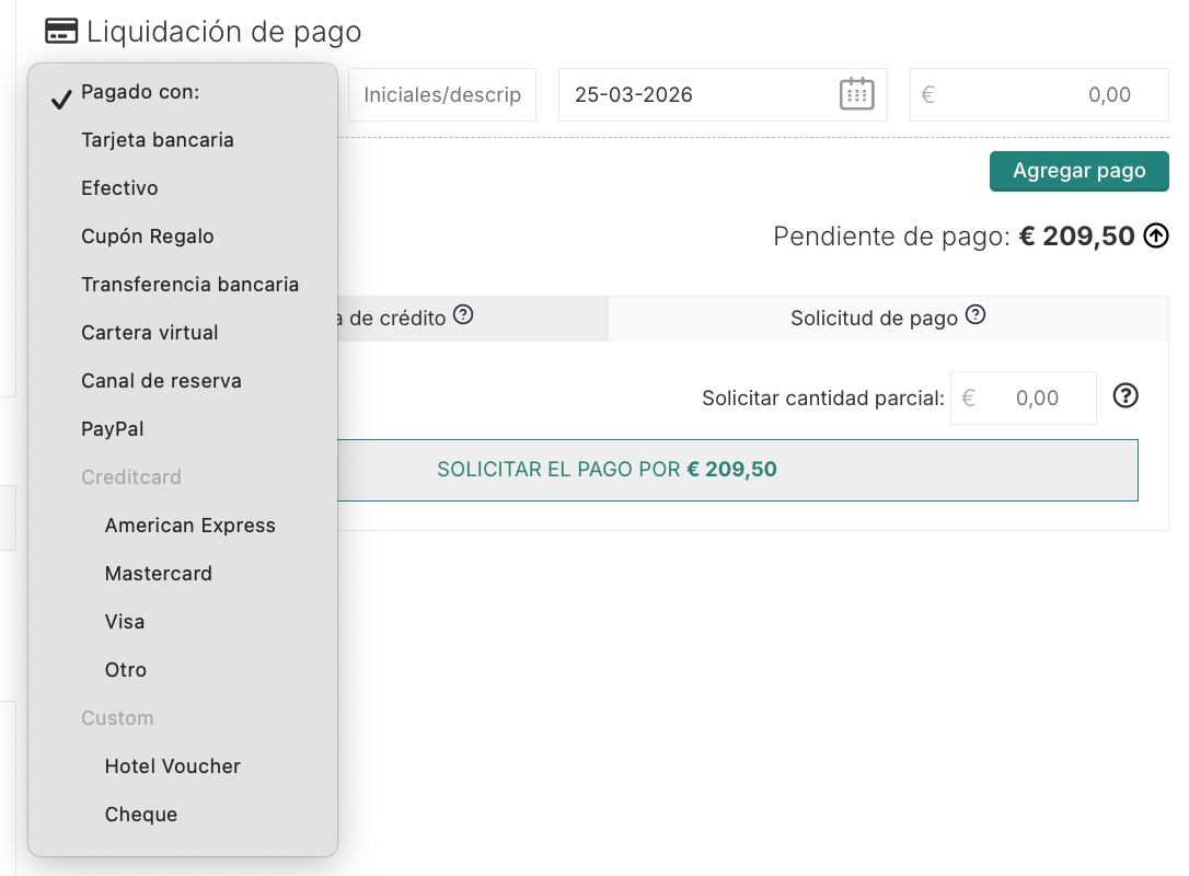 Los métodos de pago personalizados aparecerán como opción en el desplegable “Pagado con” al registrar pagos en una reserva.
