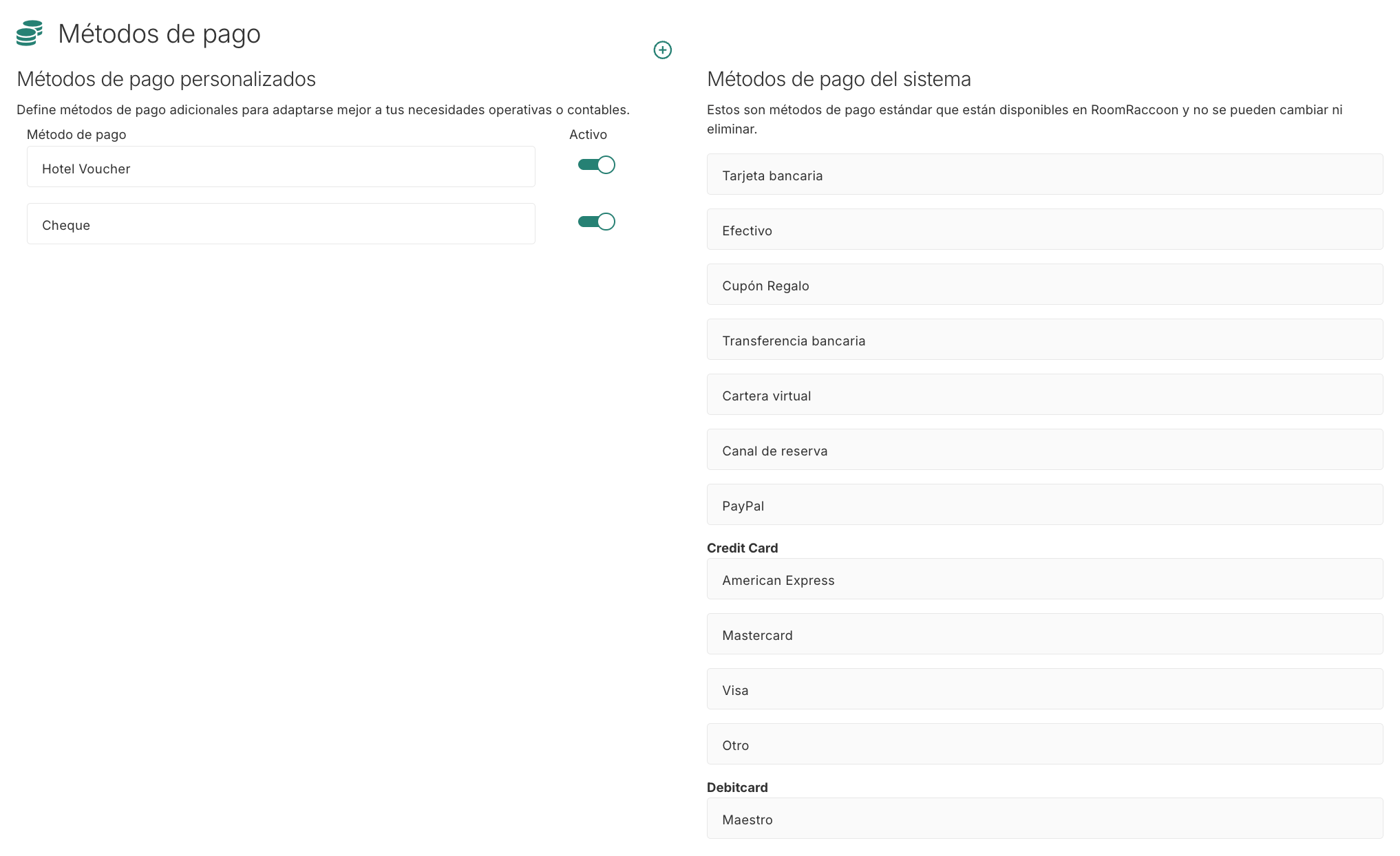 En el lado derecho verás los métodos de pago del sistema. Estos son los métodos estándar de RoomRaccoon y no pueden editarse ni archivarse.