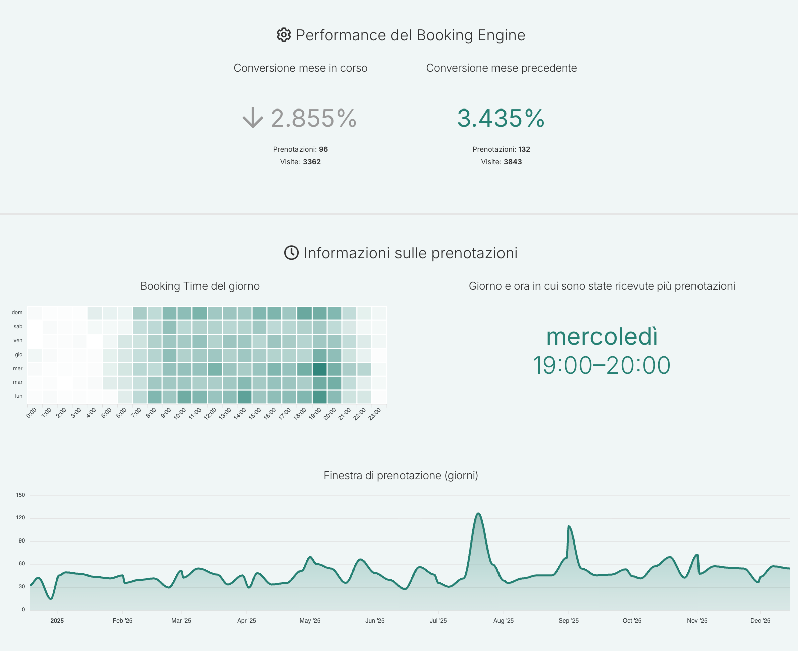 La dashboard fornisce anche dati utili sulle performance del tuo Booking Engine: