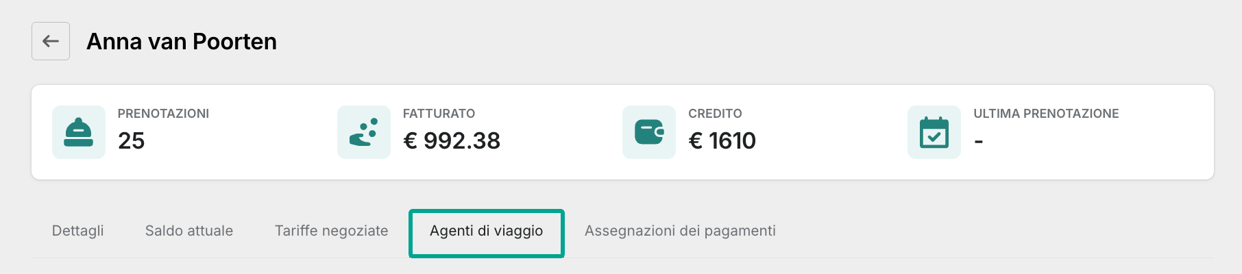 La scheda Agenzie di viaggio nel profilo del booker ti consente di creare e gestire facilmente i profili secondari delle agenzie di viaggio, collegandoli a un profilo principale di un booker o di un’azienda.