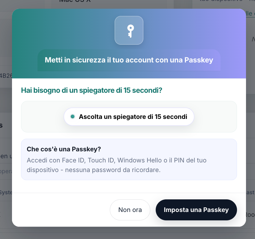 Nota: Le Passkey sono supportate dalla maggior parte dei browser e dispositivi moderni. Per la migliore esperienza, utilizza l’ultima versione di Chrome, Safari o Edge.