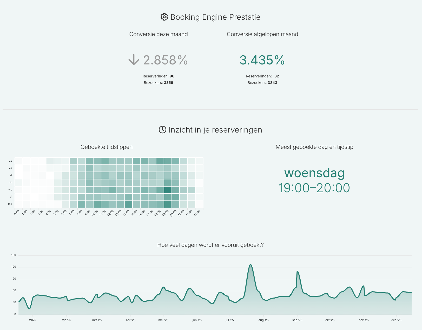 Inzichten in de booking engine: Informatie over je meest gebruikte tijd en dag.
