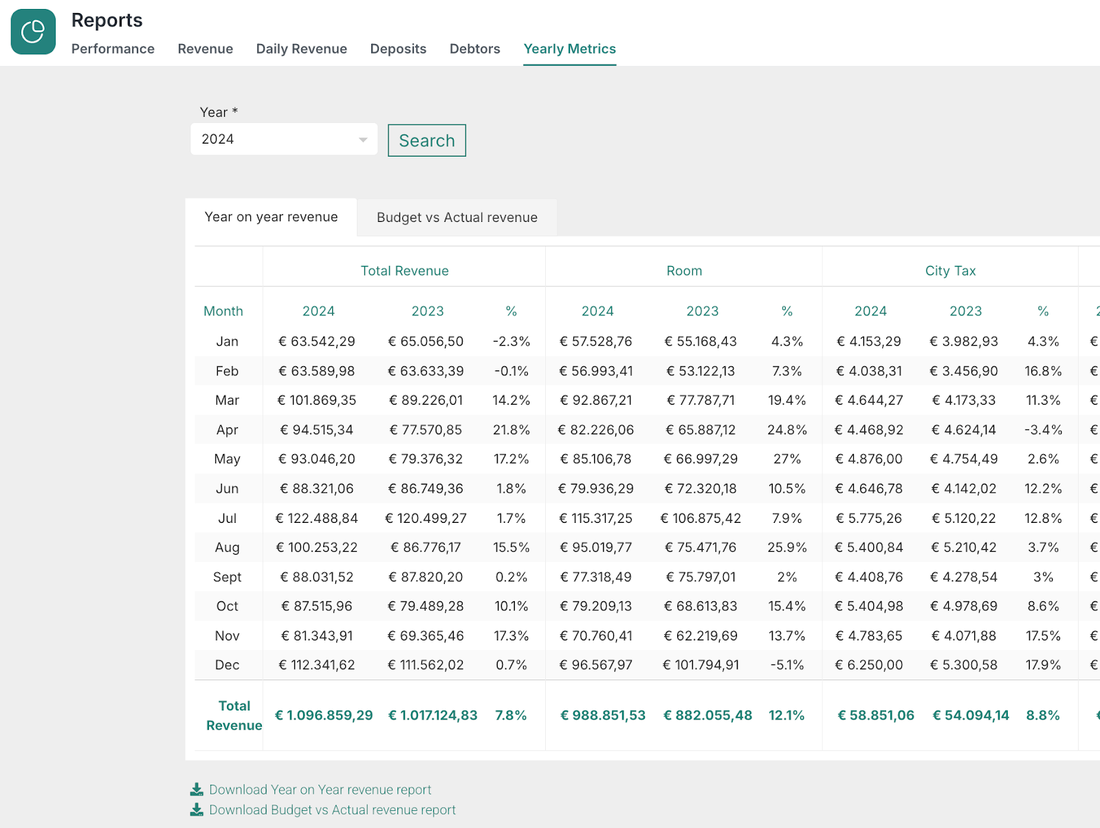 Os Relatórios Ano-a-Ano oferecem uma visão clara do desempenho do seu hotel ao comparar um ano com o ano anterior, permitindo analisar a evolução das receitas e das tendências operacionais. Estas análises são ideais para acompanhar o crescimento, identificar pontos fortes ou áreas a melhorar e tomar decisões baseadas em dados reais.
